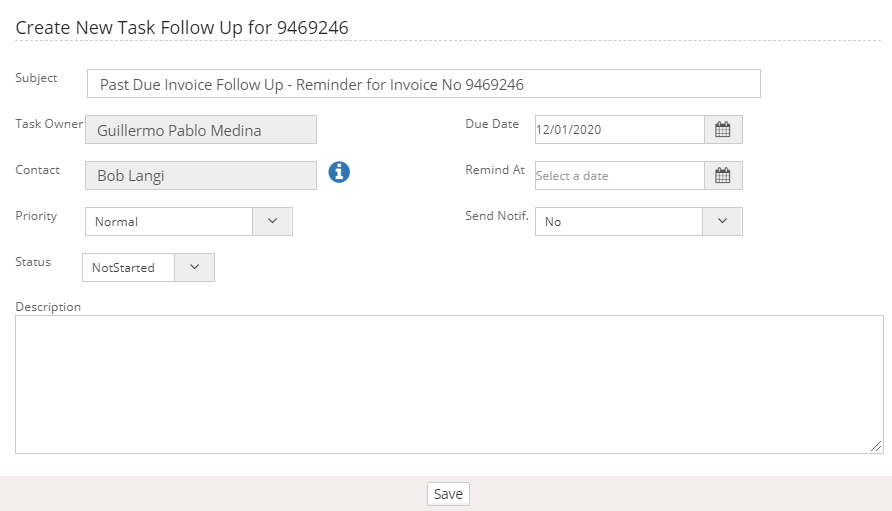 A window will pop up to create a new follow-up event and notify the customer about their debt.